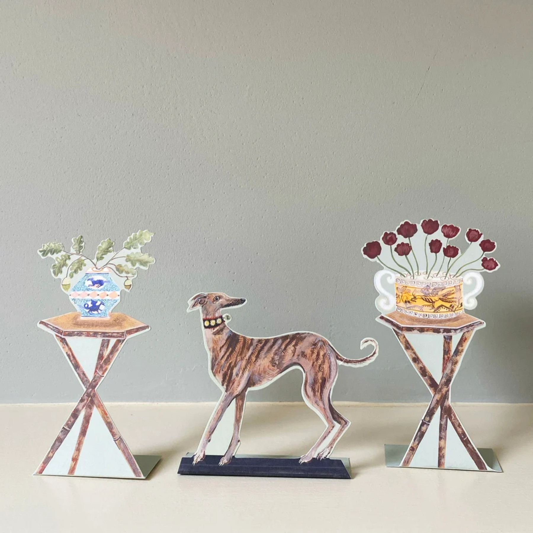 Interactive Display: Arrives flat and folds open into a Dutch gable house, complete with pop-up tables, floral vases, and a brindle whippet.