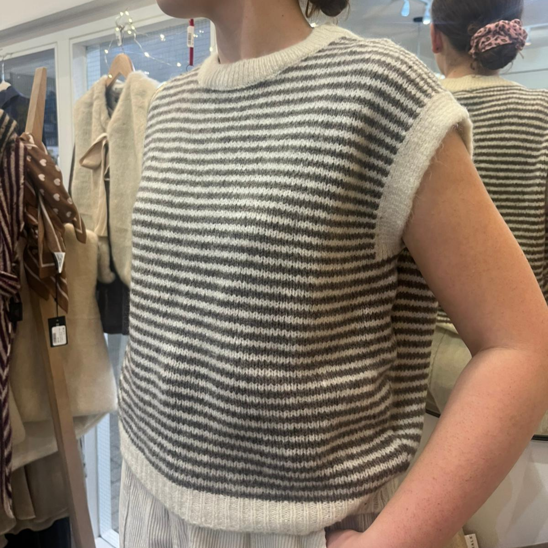 Crafted in Italy from a soft, lightweight wool blend, the Alma Striped Vest is a timeless layering piece designed for effortless style. Its fine contrasting stripes and ribbed trims at the neckline, armholes, and hem create a polished, refined finish, while the relaxed boxy fit makes it perfect for layering over shirts, blouses, or dresses.