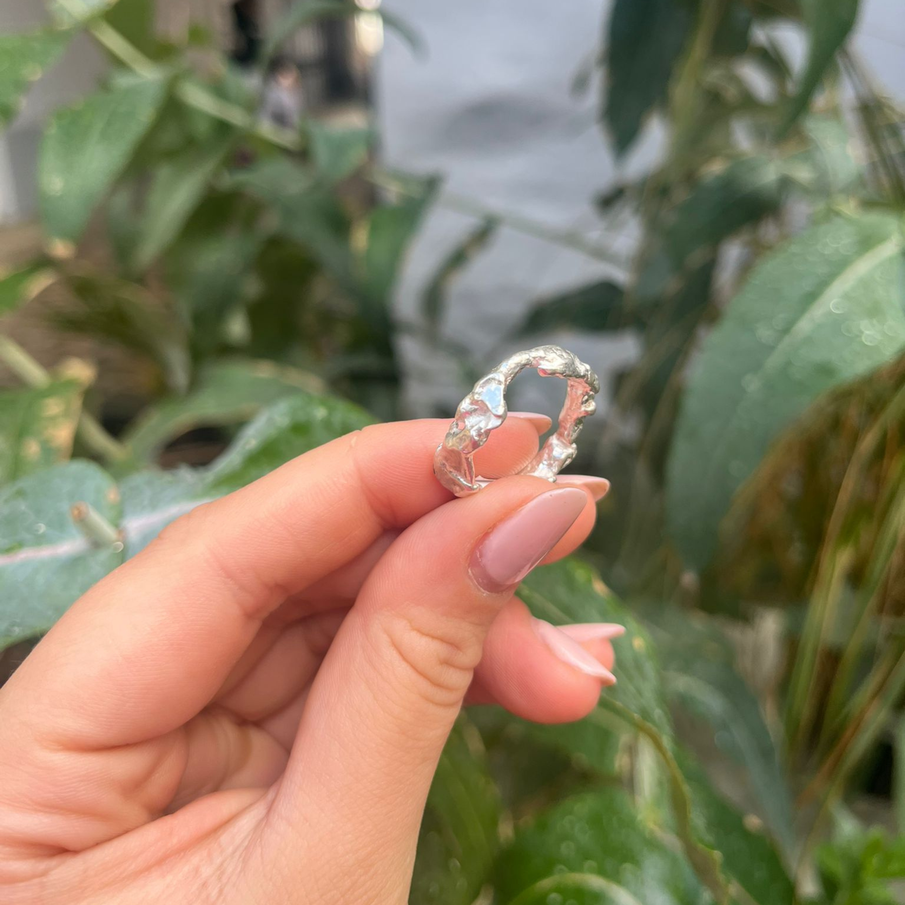 The Fused Silver Ring – Nouveau is a one-of-a-kind piece, handmade in Cornwall by Sarah Drew. Each ring is created by heating recycled eco-silver until it bubbles and then cooling it quickly in water, capturing an organic texture that makes every piece beautifully unique.