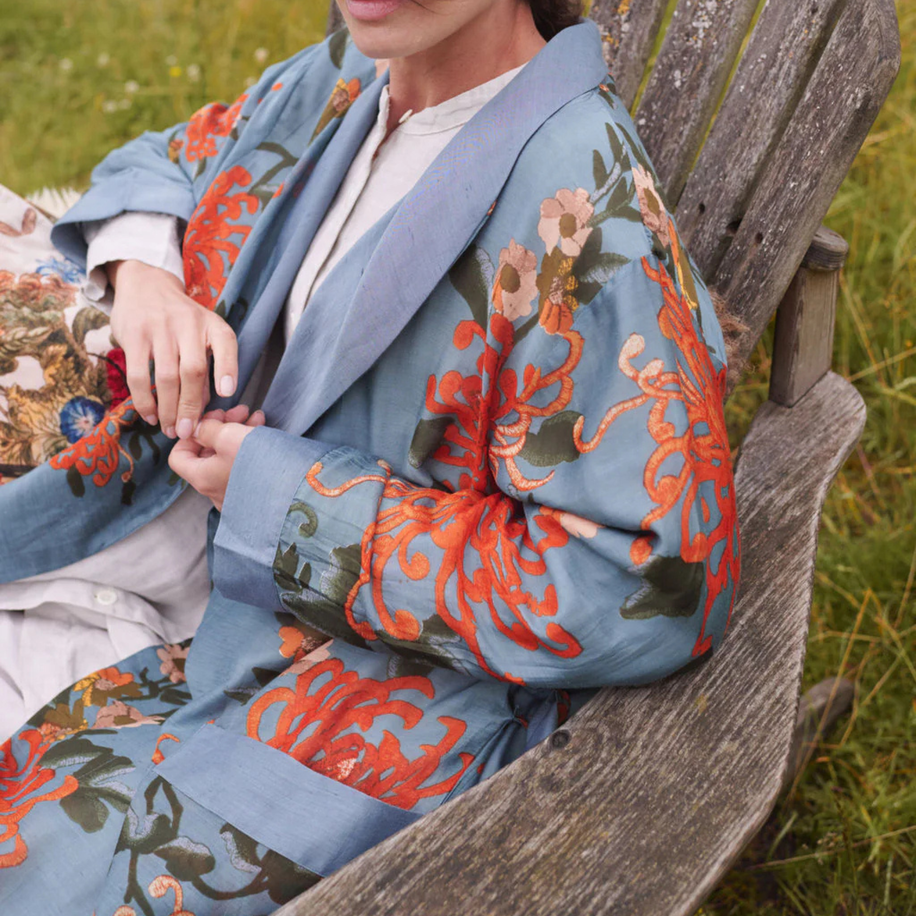 A beautifully crafted piece that combines luxury, comfort, and timeless style- adorned with delicate orange chrysanthemum-inspired florals. Thoughtfully designed with sustainability and longevity in mind, it also makes a considered and stylish gift.