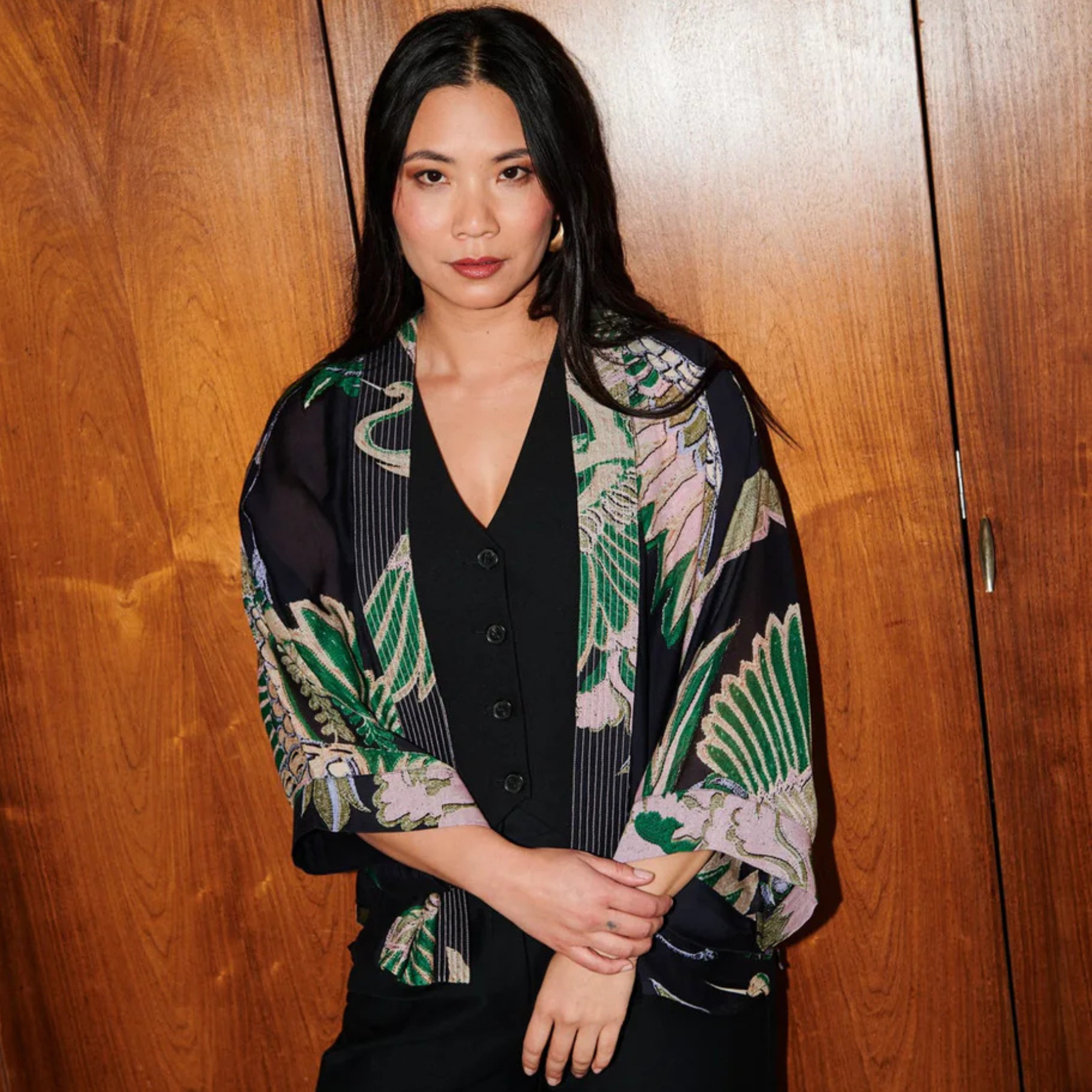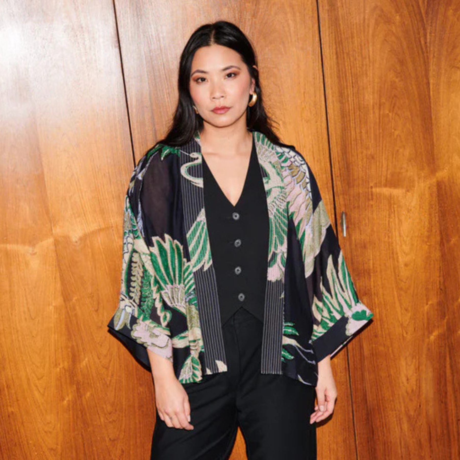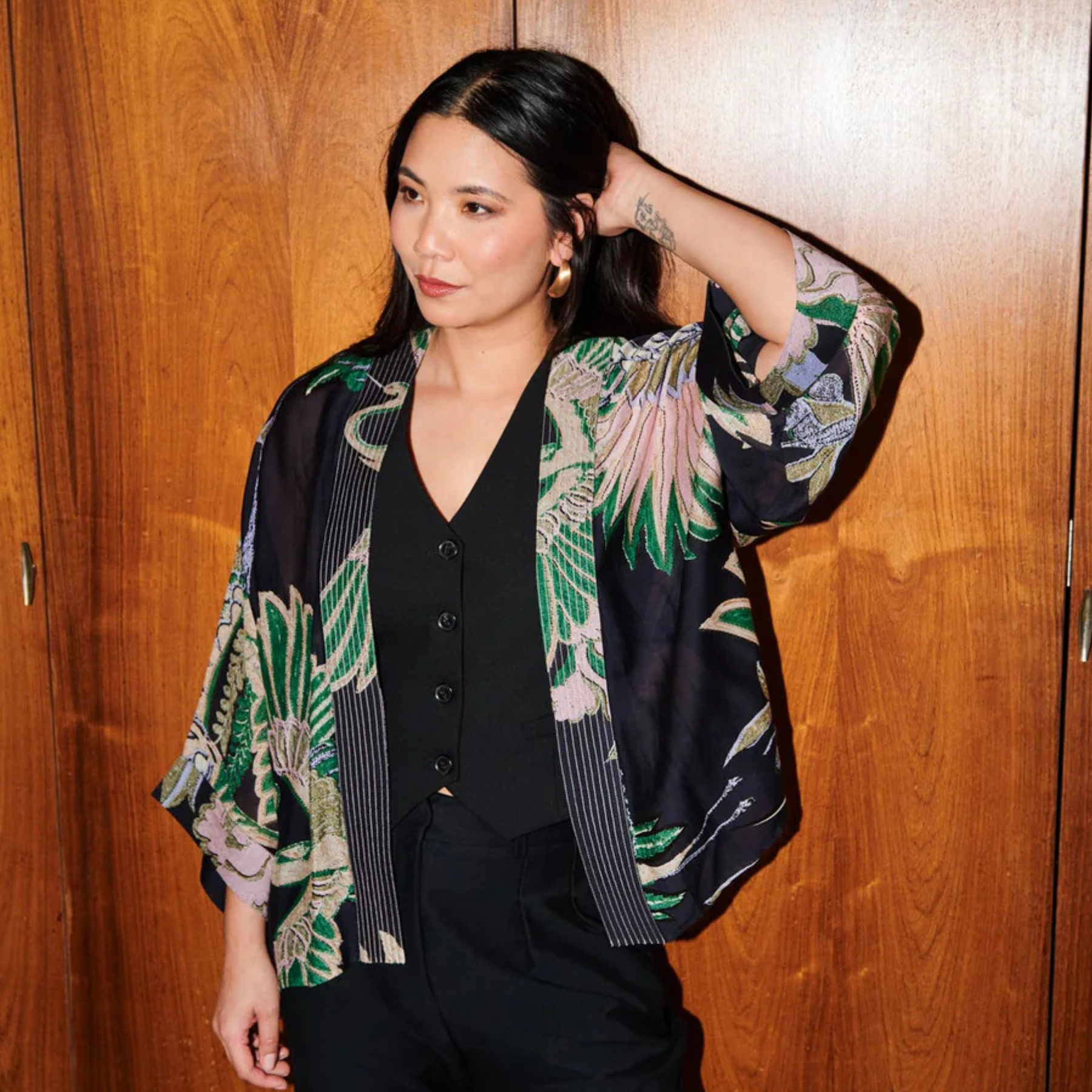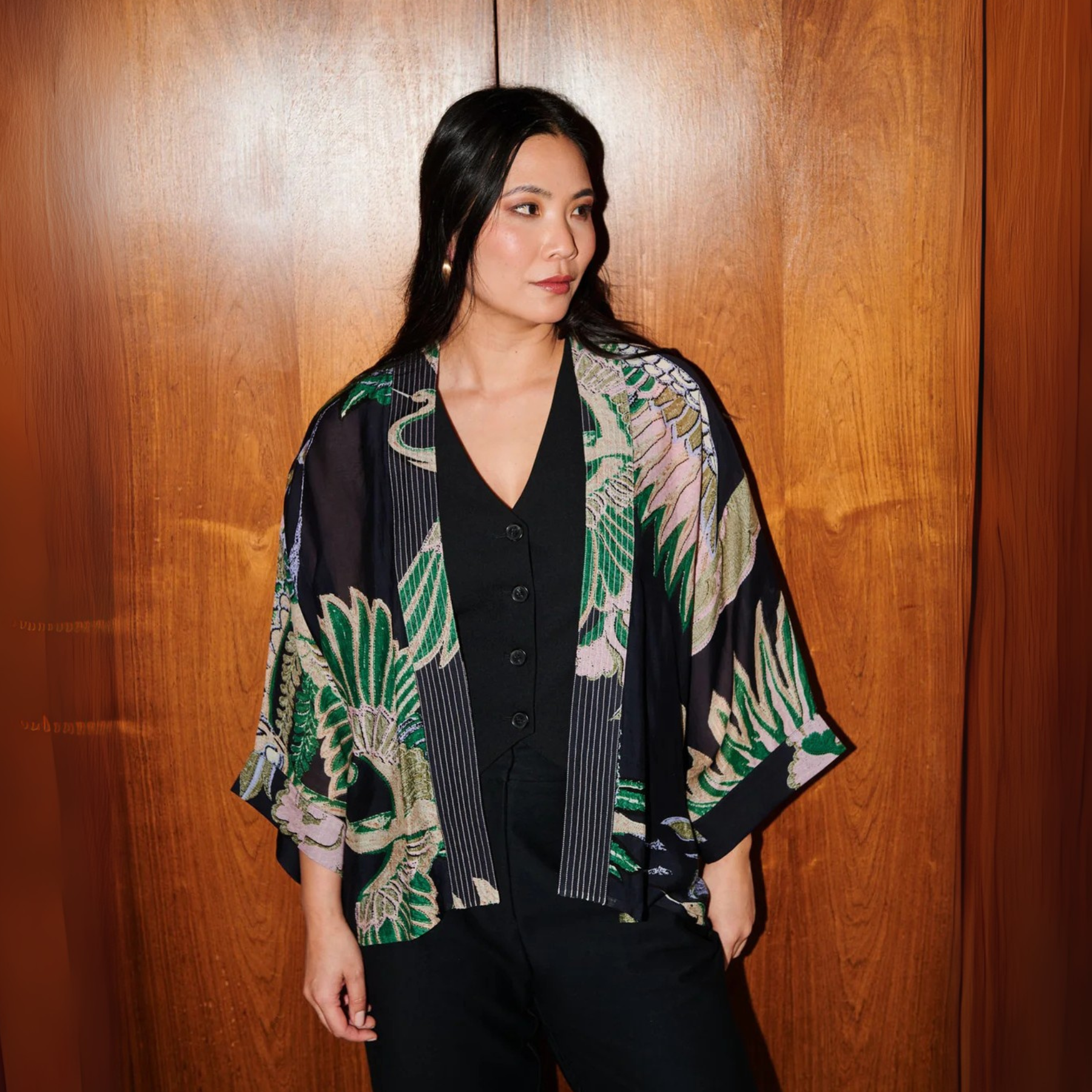 With its bold crane print and relaxed fit, it’s perfect for layering over casual looks or dressing up for a special occasion. Crafted from sustainable fabrics, this kimono offers both style and comfort, making it a timeless addition to any wardrobe.