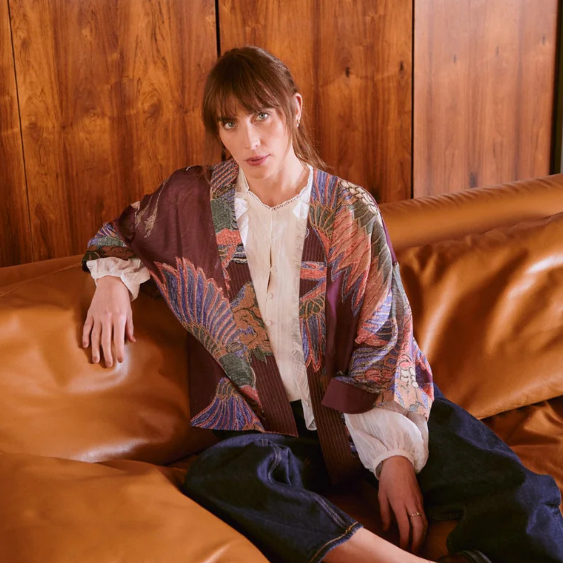 With its bold crane print and relaxed fit, it’s perfect for layering over casual looks or dressing up for a special occasion. Crafted from sustainable fabrics, this kimono offers both style and comfort, making it a timeless addition to any wardrobe.