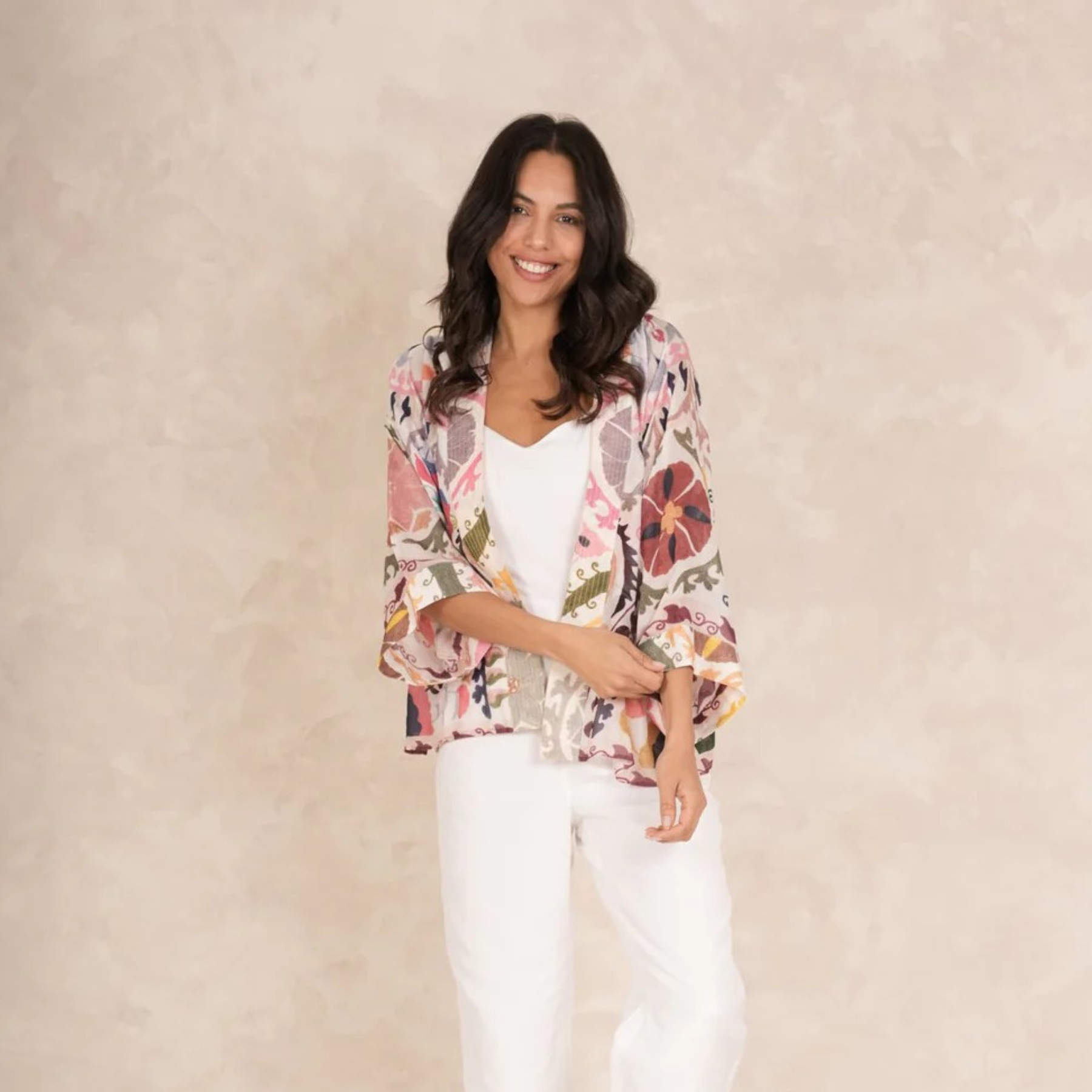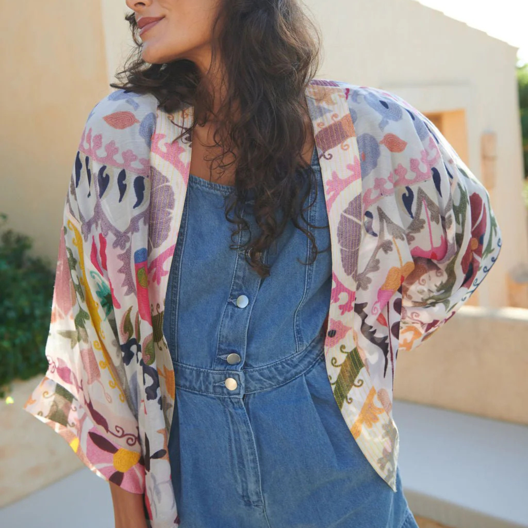 An elegant kimono in a bold pink palette, inspired by traditional East Asian Suzani embroidery. This is a versatile piece that works beautifully for layering over evening wear or styled casually with everyday basics.