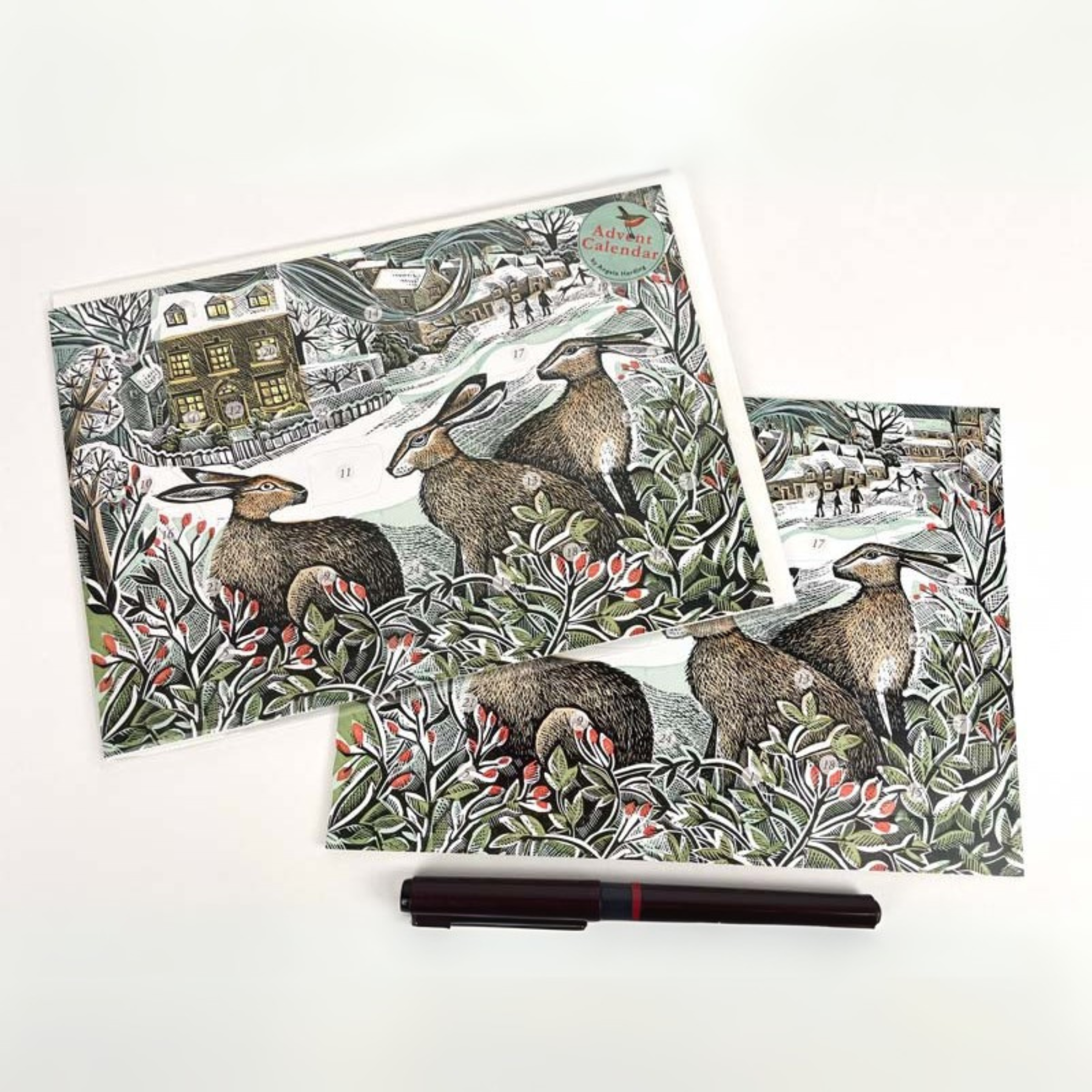 A beautifully crafted free-standing 3D advent calendar, inspired by Angela Harding’s We Three Hares artwork. This charming design captures a traditional winter scene, complete with two free-standing turtle doves, bringing festive warmth and joy to any home.
