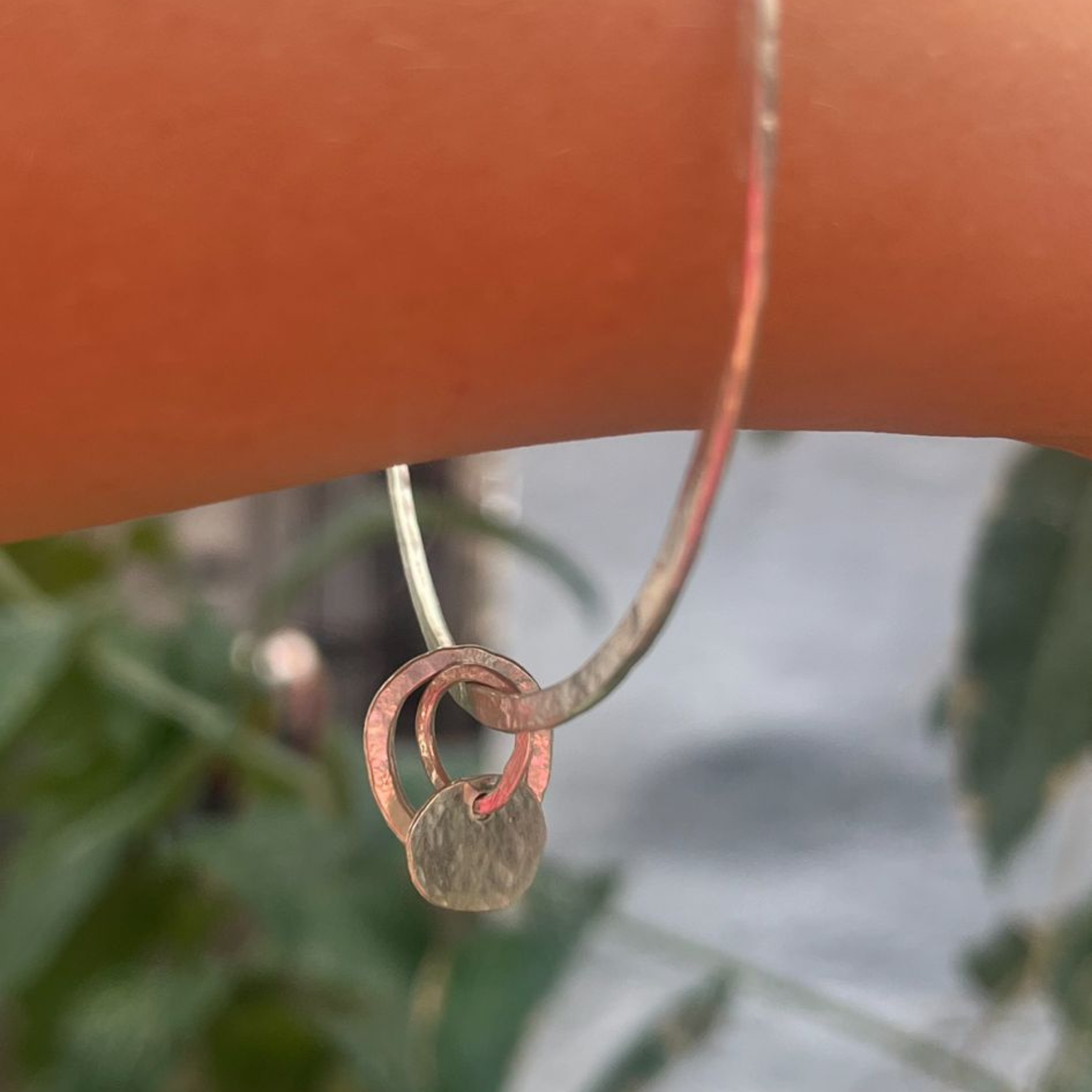 A tiny silver pebble charm and small hammered ovals give it character — simple, stylish, and effortlessly wearable. It’s light enough to stack or wear every day, yet has that special finish that makes it a thoughtful gift too.