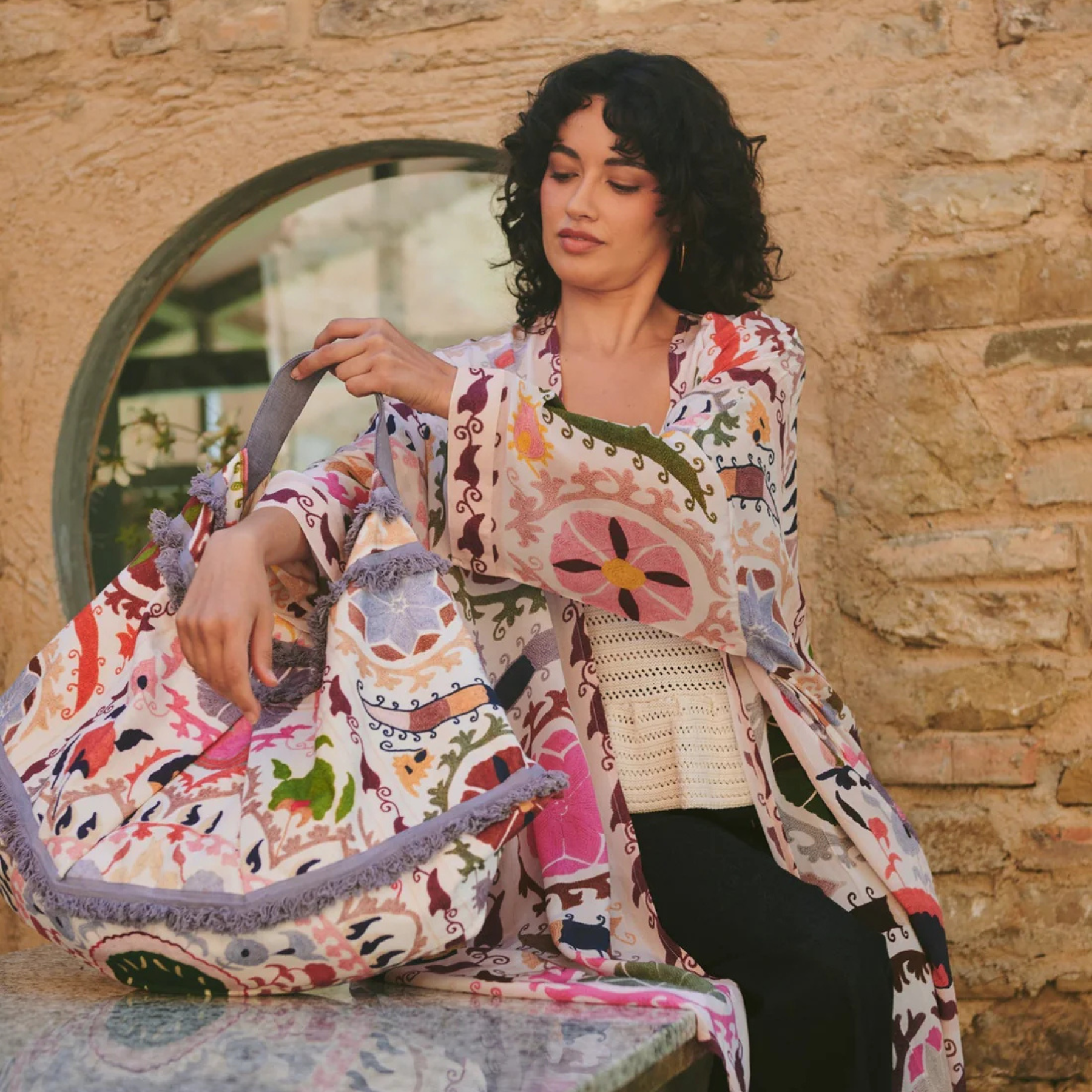 A bold oversized pattern in a pink colour palette. Inspired by the Suzani pattern originating from East Asia, made by embroidering a chain stitch pattern to a cloth base.