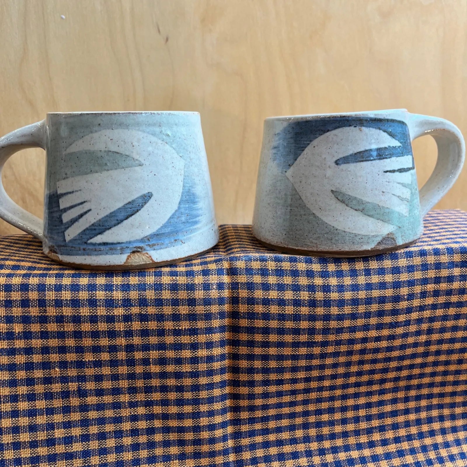 Muted blue and green brushstroke reveal a bird decoration, and they are glazed in an iron rich tin glaze. They hold around 250ml.